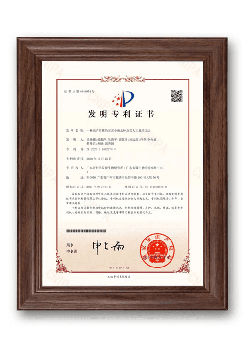 品種專利 《一種高產多糖的靈芝少孢品種及其人工栽培方法》 專利號:ZL 2020 1 1482279.3