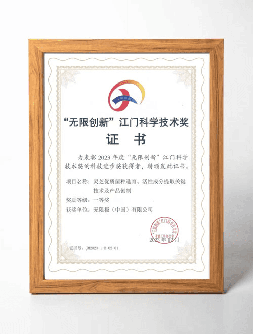 🏆 2023年度「無限創新」江門科學技術獎 科技進步獎一等獎 科技進步獎一等獎是對企業整體研發能力最直接的認可,代表無限極在靈芝科技領域的系統性創新已達到業界一流水準。