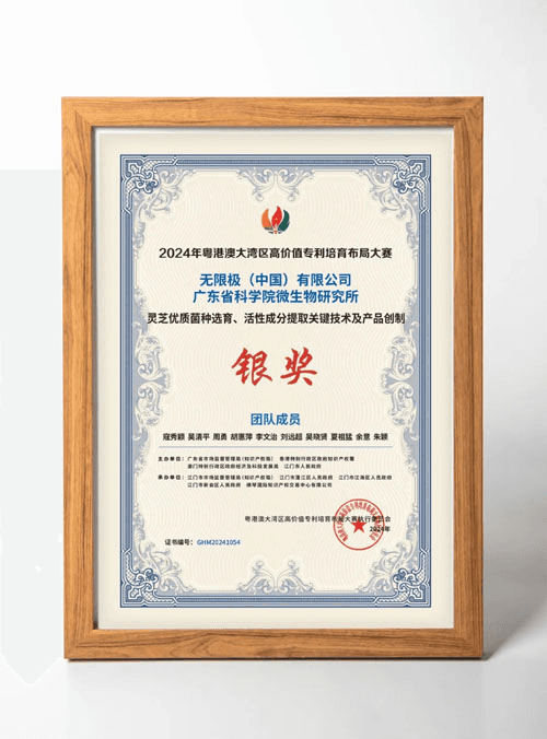 🏅 2024年 粵港澳大灣區高價值專利培育布局大賽(灣高賽)銀獎 這是大灣區最具代表性的專利價值評選賽事,銀獎肯定了無限極靈芝專利在技術創新與市場應用潛力上的高度價值。
