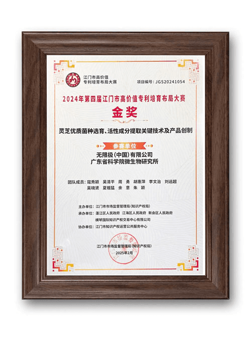 🥇 2024年 第四屆江門市高價值專利培育布局大賽(江高賽)金獎 在地區級最高規格的專利競賽中摘下金獎,體現了無限極靈芝研發成果在同業中的領先地位。
