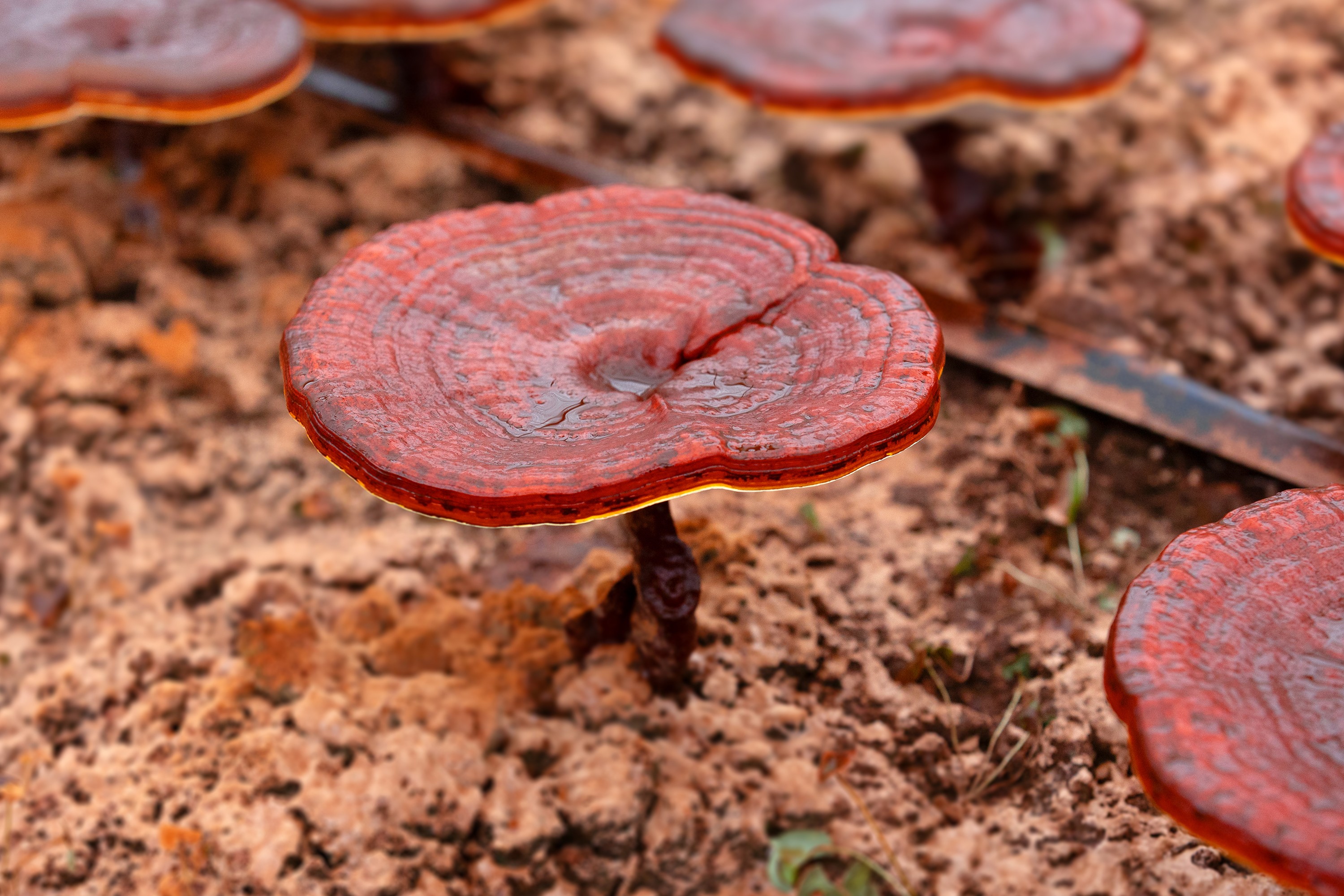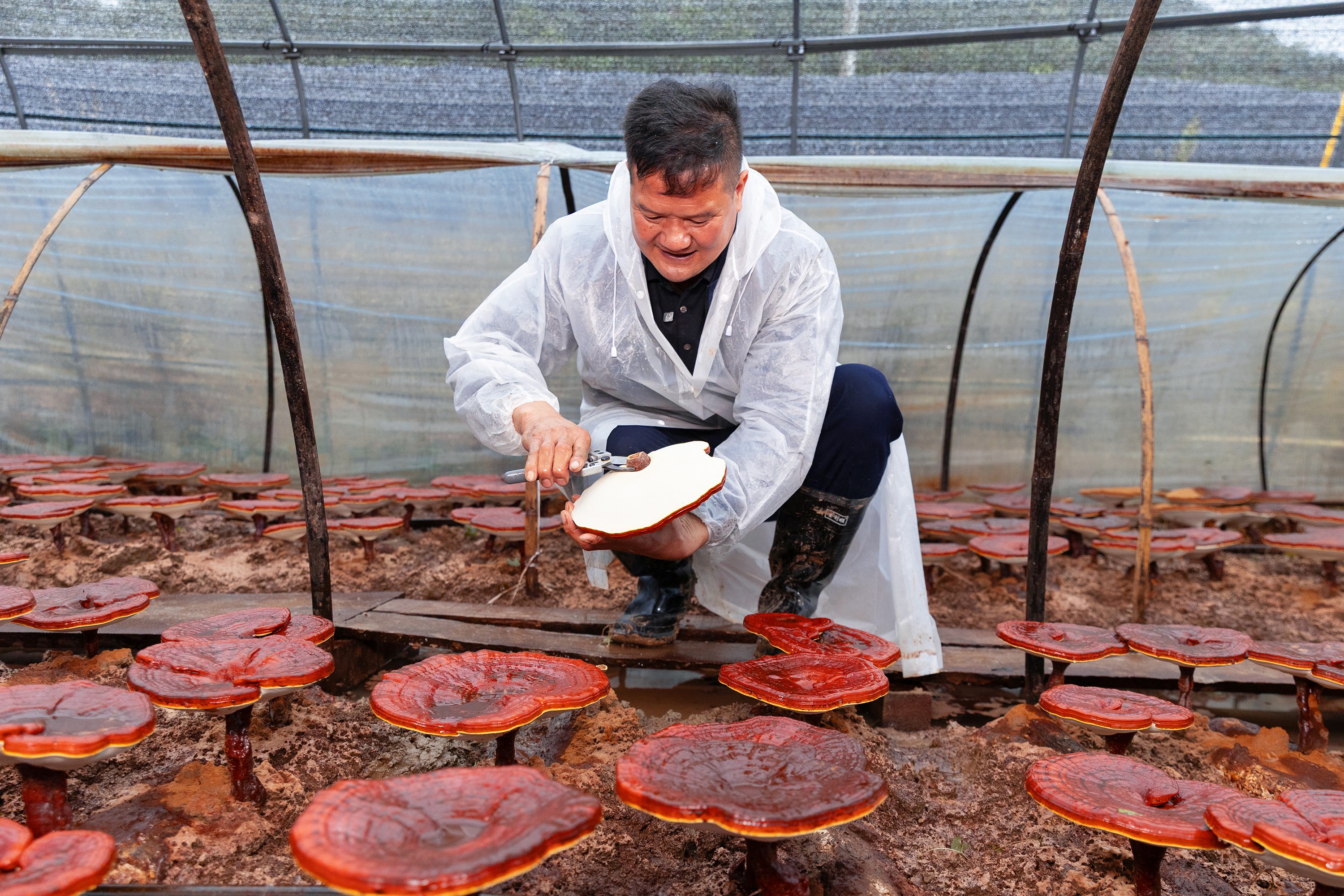 嚴格的採收時機判斷: 只有菌蓋邊緣剛好長出五圈左右、直徑超過10公分的赤靈芝,才符合採收資格。這個時機點,是靈芝活性成分累積最為豐富的黃金時期。
